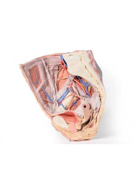 Questo modello di dissezione pelvi destra femminile stampata in 3D rappresenta un bacino destro femminile, sezionato lungo il piano sagittale medio e trasversalmente al livello delle vertebre L4 e della coscia prossimale.