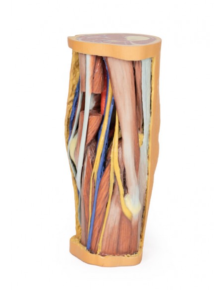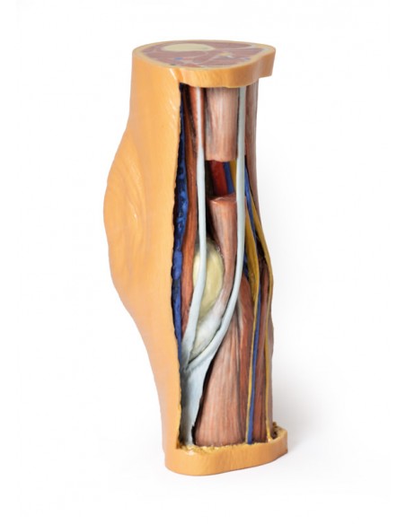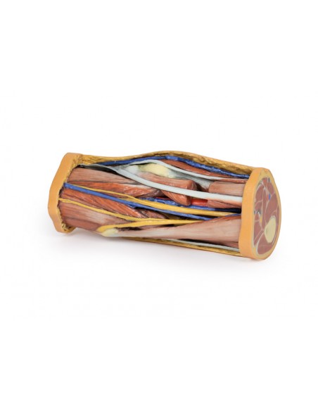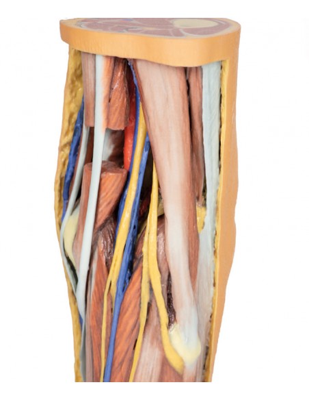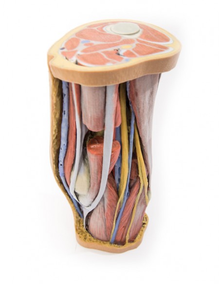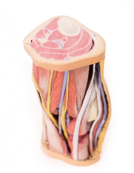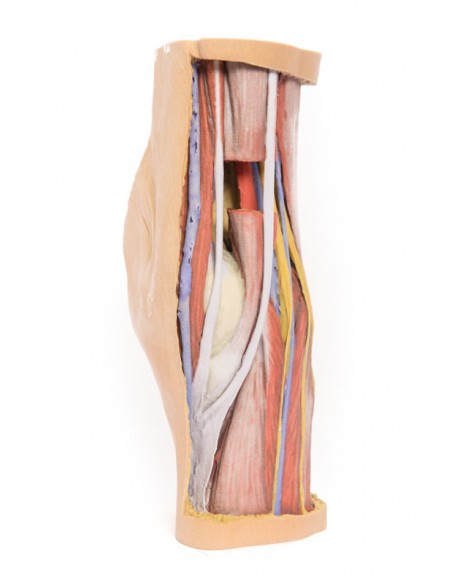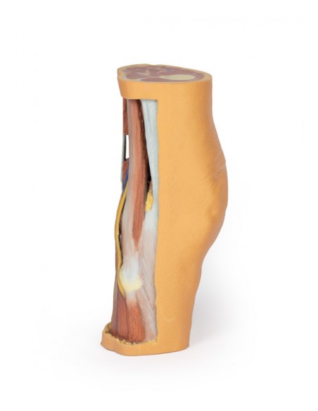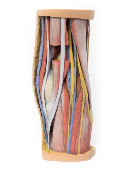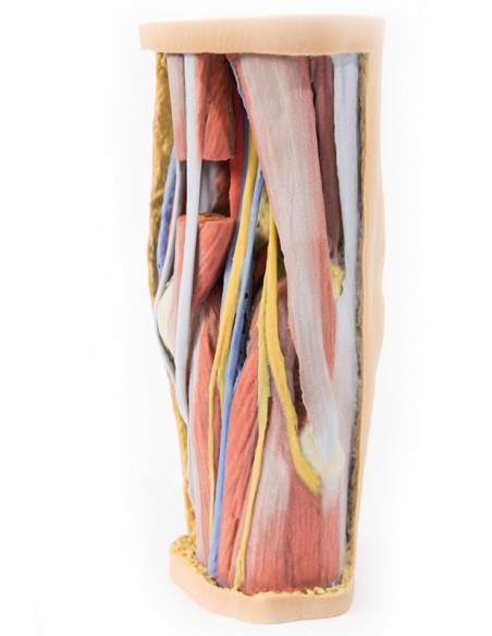 Questo modello di dissezione stampato in 3D è la riproduce la coscia distale e la gamba prossimale, sezionate posteriormente per dimostrare il contenuto della fossa poplitea e della regione circostante. La sezione trasversale prossimale mostra i muscoli del compartimento anteriore, posteriore e mediale, con l'arteria femorale e la vena visibili all'interno del canale adduttore. Sono visibili anche il nervo sciatico e la grande vena safena.
