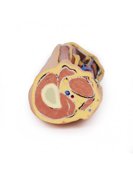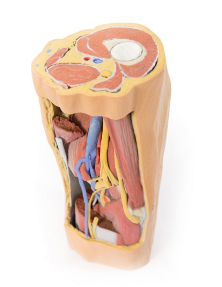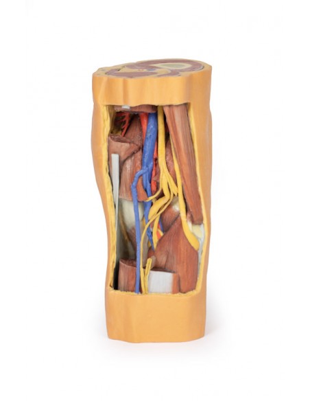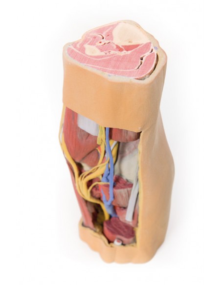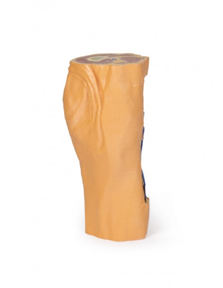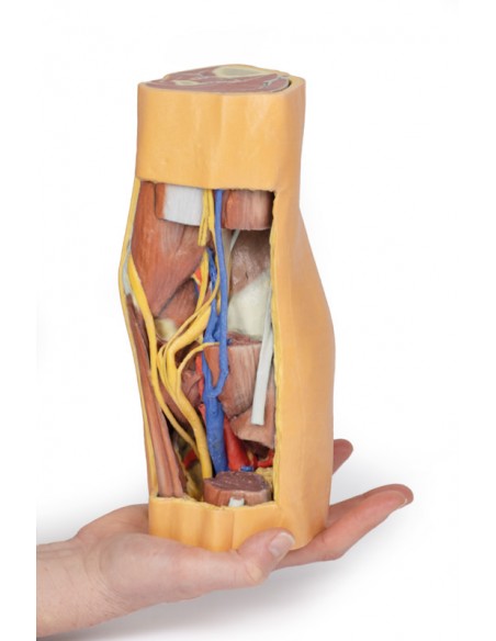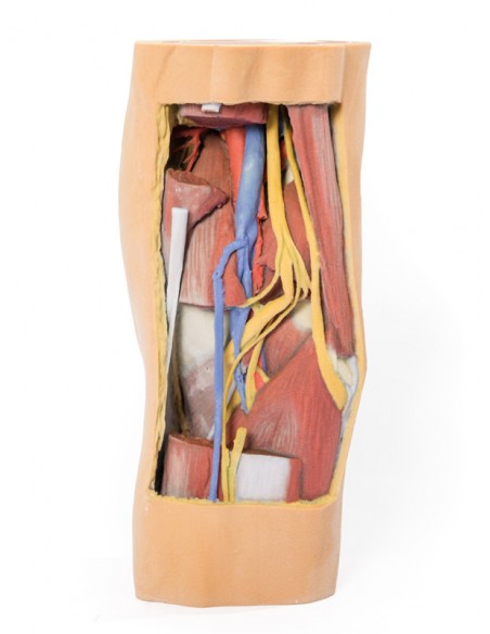 Questo modello di dissezione stampato in 3D è una riproduce la coscia distale e la gamba prossimale, sezionate posteriormente per dimostrare il contenuto della fossa poplitea e della regione circostante.