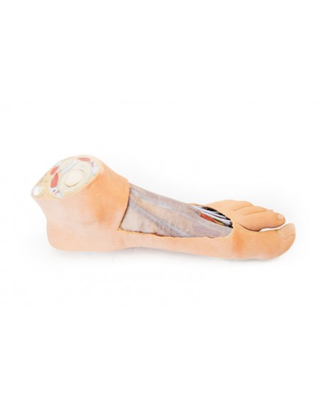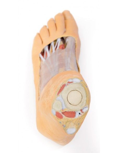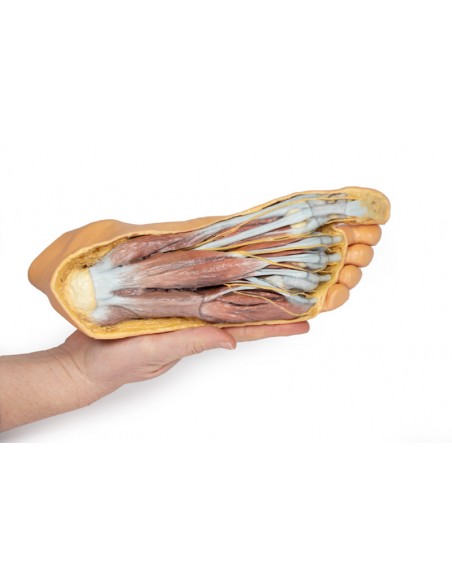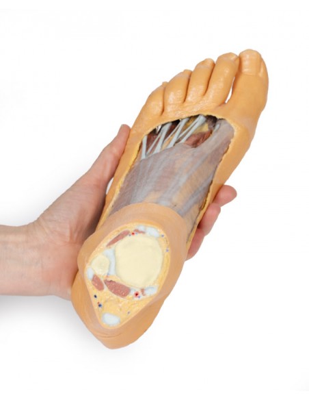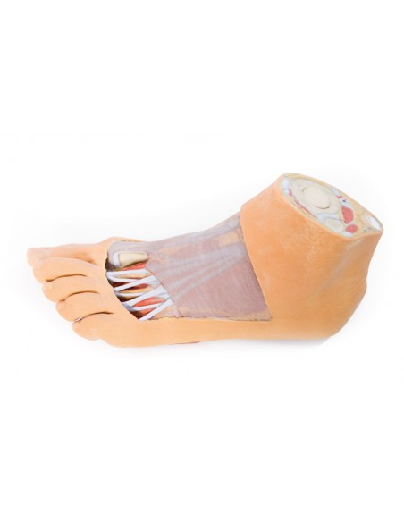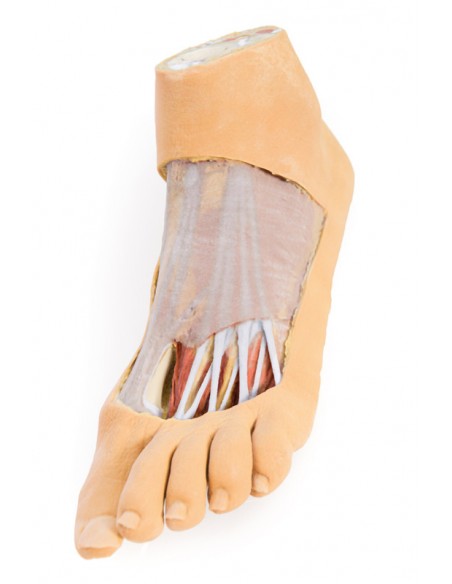 Questo modello di dissezione stampato in 3D è un piede sinistro con strutture superficiali esposte sul dorso e lo strato superficiale di muscoli e nervi sulla superficie plantare.