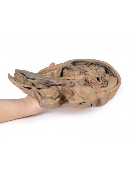 La parte anteriore della falx cerebri è stata trattenuta dal suo attacco anteriore alla cresta galli fino a circa il punto medio della sua estensione verso il tentorium cerebelli. All'attaccamento della falce, la parte della dura è stata rimossa per dimostrare l'estensione del seno sagittale superiore all'interno della porzione trattenuta della piega durale. Il cervello stesso è stato sezionato preservando il setto pellucido e il forame interventricolare (di Monro) definendo il passaggio tra il ventricolo laterale profondo e il terzo ventricolo sezionato. Questo piano di sezione cattura anche l'infundibolo che si estende dall'ipotalamo alla ghiandola pituitaria, che è situata adiacente a un seno sfenoidale ben sviluppato. Sia l'acquedotto cerebrale che il quarto ventricolo sono conservati, così come parti dell'arteria vertebrale sinistra,
