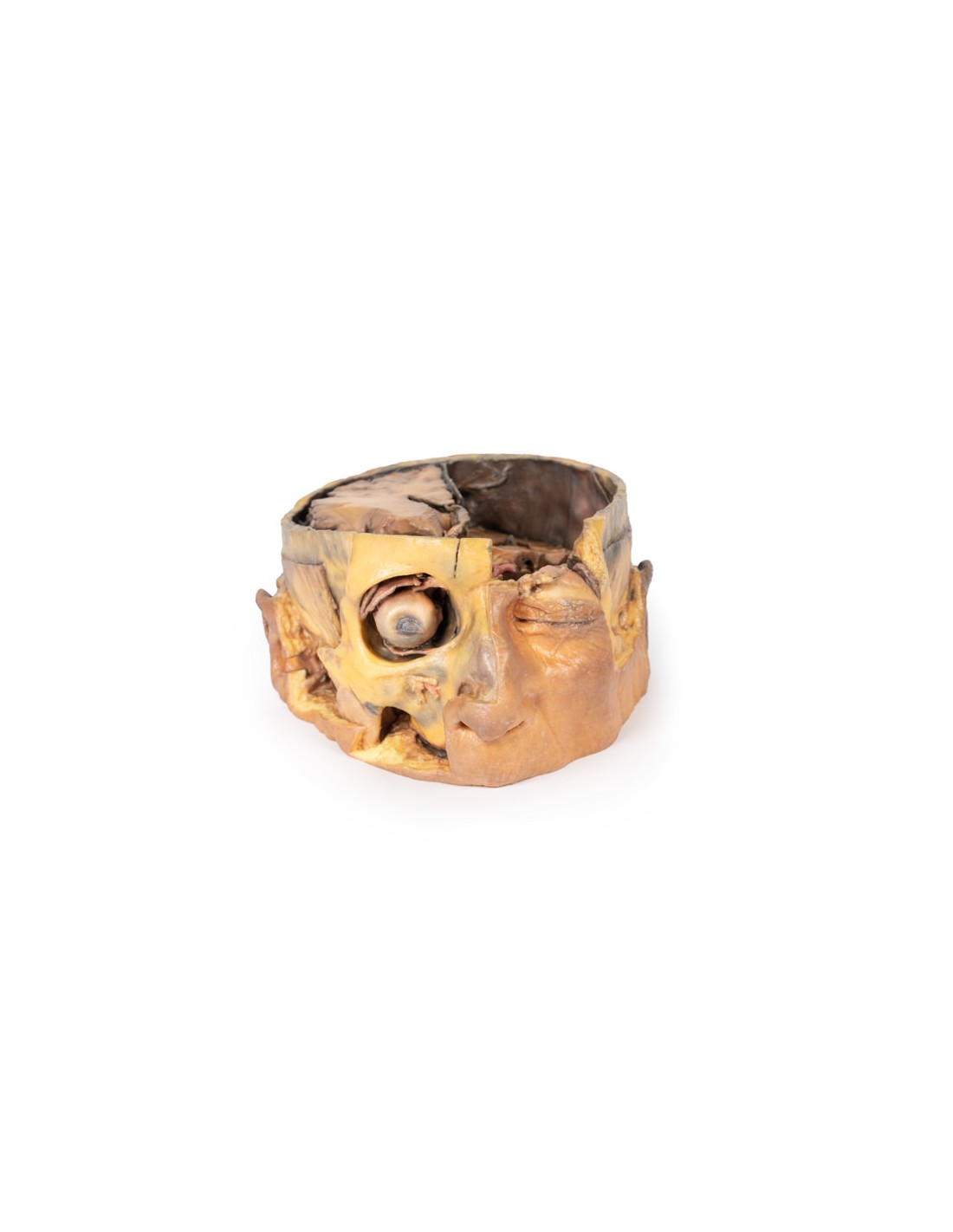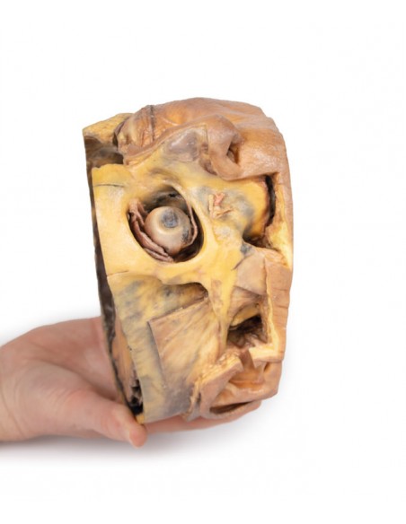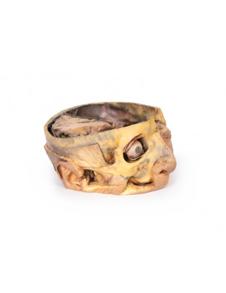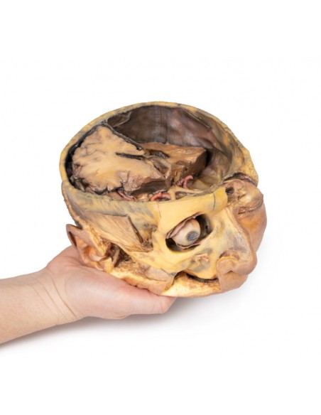 Questo modello 3D conserva una sezione trasversale della cavità cranica con dissezione parziale del cervello ed esposizione del tetto orbitale sinistro, insieme a una dissezione profonda della faccia e della regione dell'articolazione temporo-mandibolare.