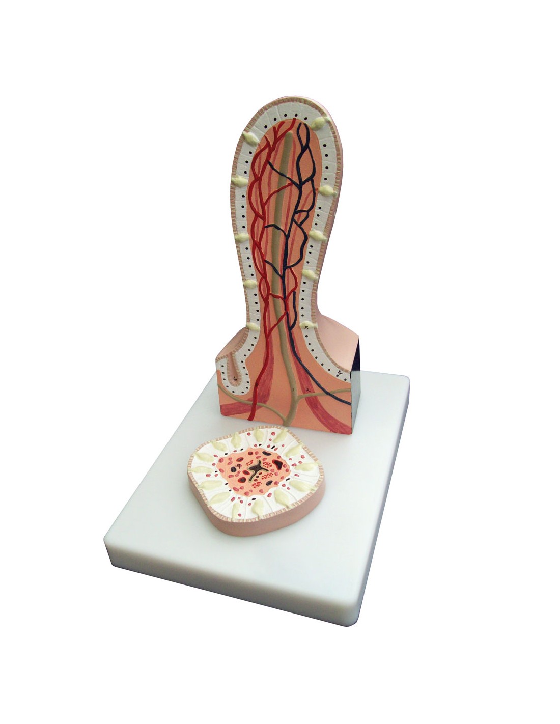 Questo modello anatomico è la rappresentazione di un villo intestinale ingrandito fortemente, e mostra in dettaglio la sezione trasversale e la sezione longitudinale.