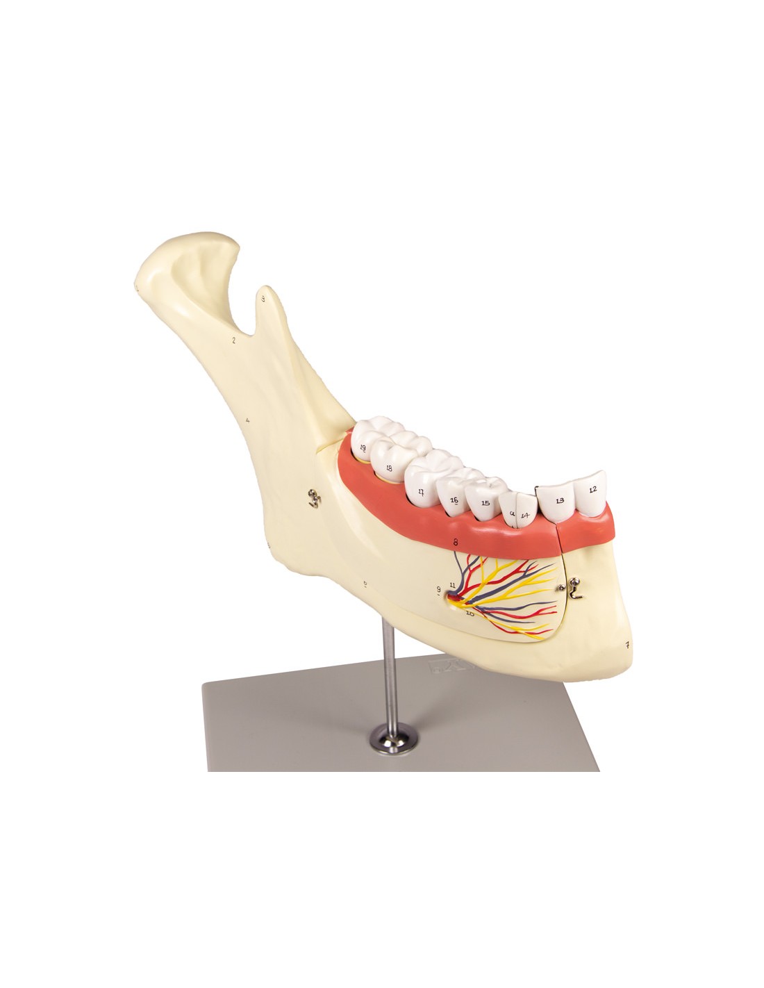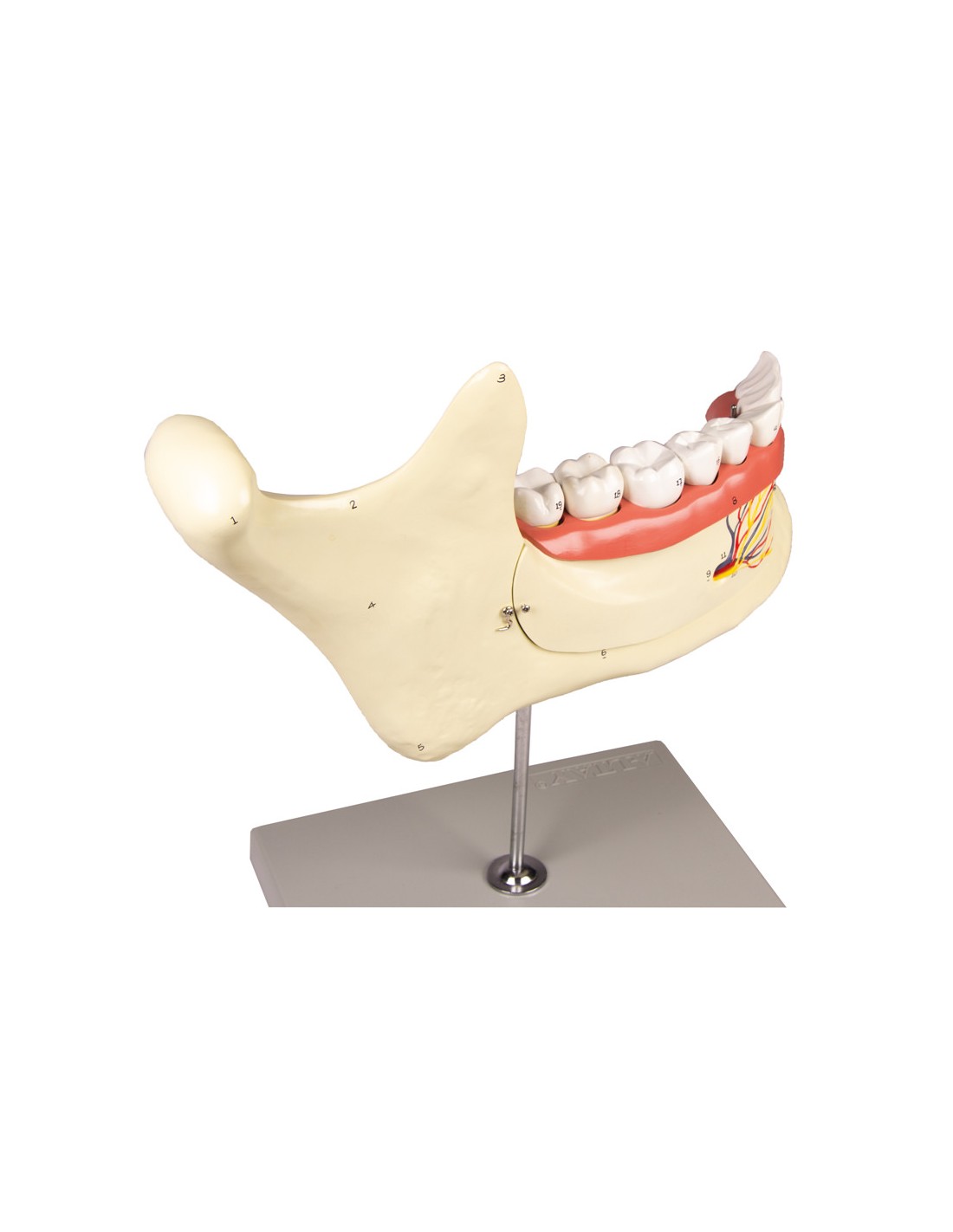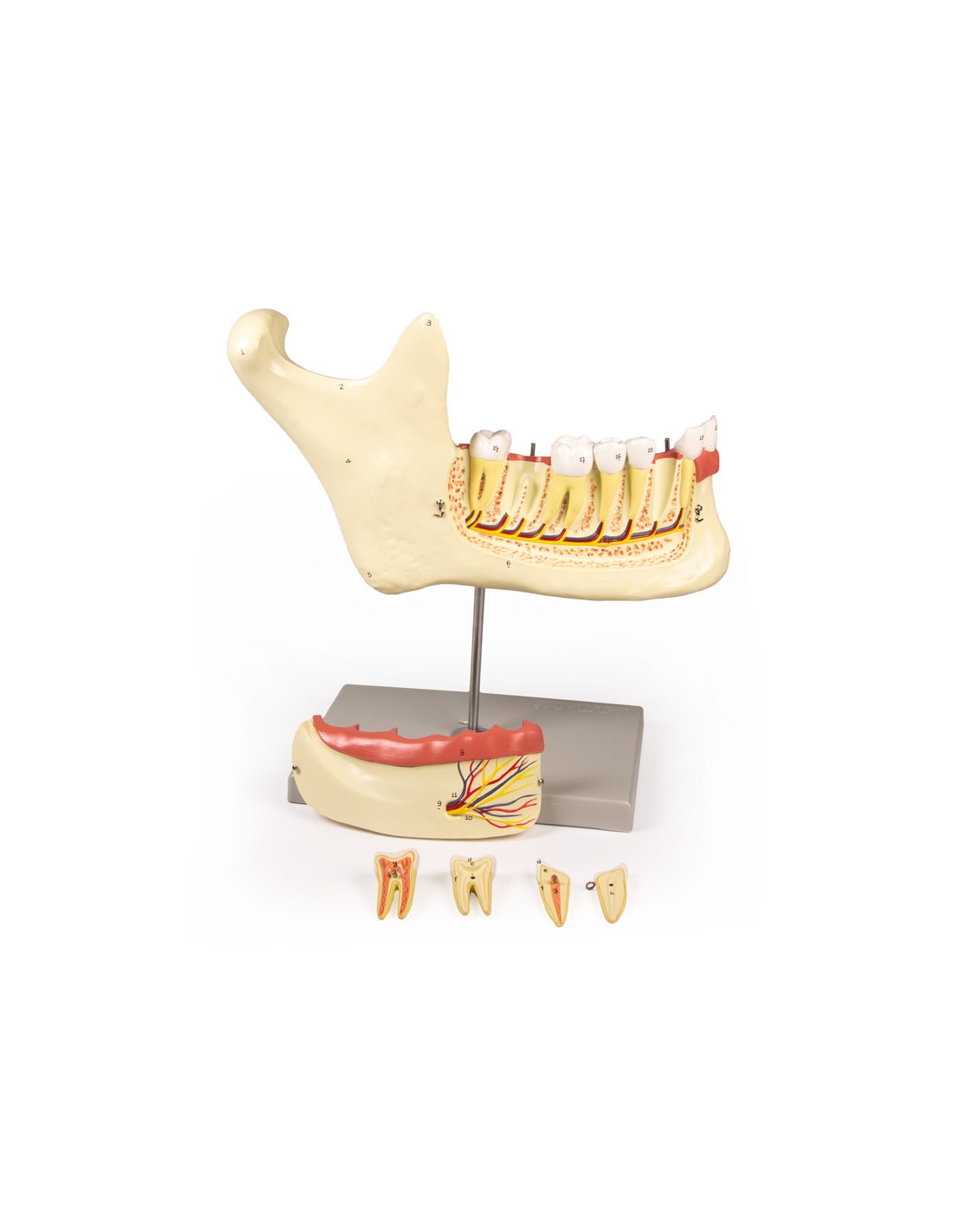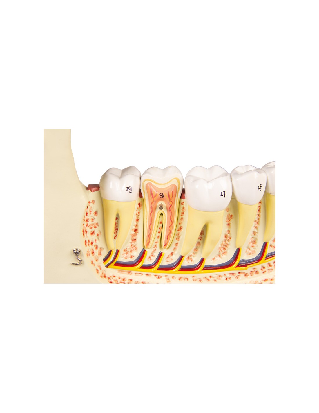 Questo straordinario modello in sei parti, ingrandito tre volte rispetto alla dimensione naturale, mostra tutte le caratteristiche della mandibola adulta, anche nei più piccoli dettagli.