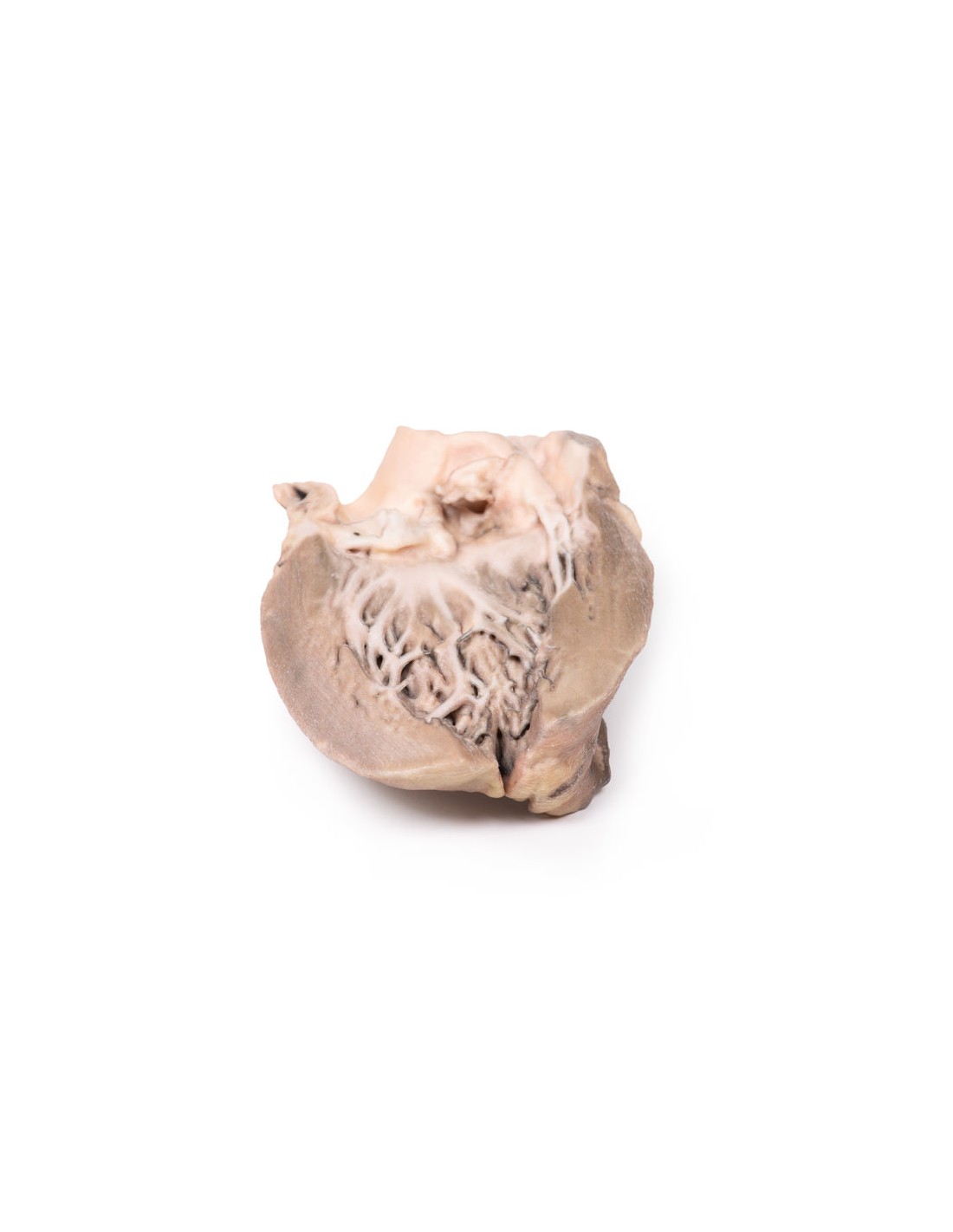 Questo piccolo cuore mostra il ventricolo sinistro e le valvole associate. La cuspide non coronarica della valvola aortica è ulcerata e perforata e presenta vegetazioni friabili attaccate. Immediatamente sotto questa cuspide una perforazione si estende nell'atrio destro appena sopra la valvola tricuspide (vedi retro del campione. Anche l'altra cuspide aortica è ispessita. Si tratta di un'endocardite batterica acuta con cuspide aortica e perforazioni atrioventricolari.