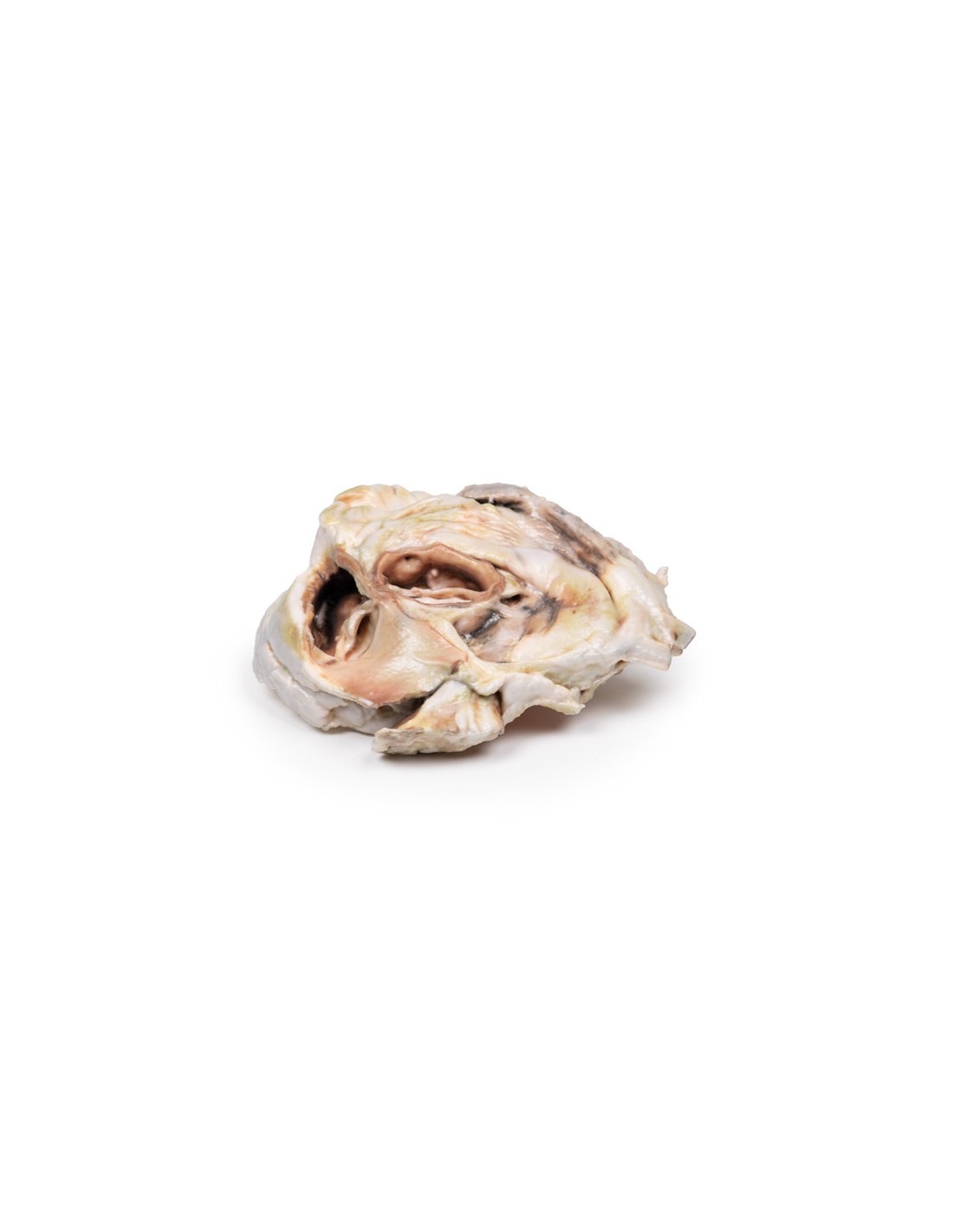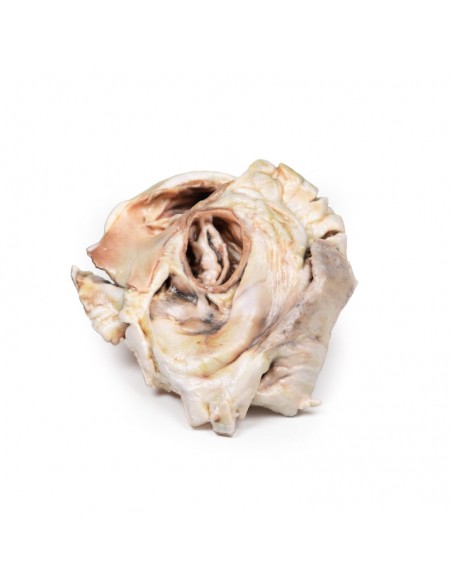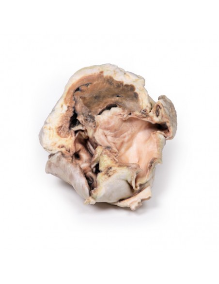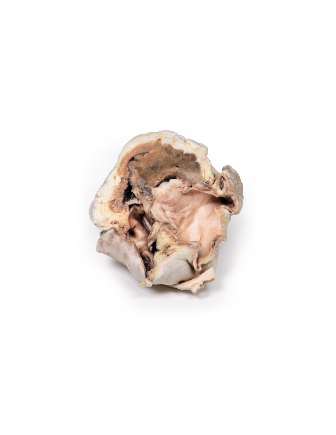 Il campione è una fetta orizzontale parziale di 1,5 cm attraverso il piano dell'atrio sinistro il cui rivestimento interno liscio insieme all'appendice auricolare sinistra e parte del ventricolo sinistro sono visibili sull'aspetto inferiore. Sulla faccia superiore del tronco polmonare (e parte della valvola tricuspide polmonare) e dell'aorta, inclusa la valvola bicuspide anormale interessata, sono chiaramente distinguibili. Aggregazioni calcificate o ispessimenti sui margini opposti della valva possono essere visti da questa prospettiva superiore. C'è anche una regione di calcificazione su una delle cuspidi delle valvole polmonari.
