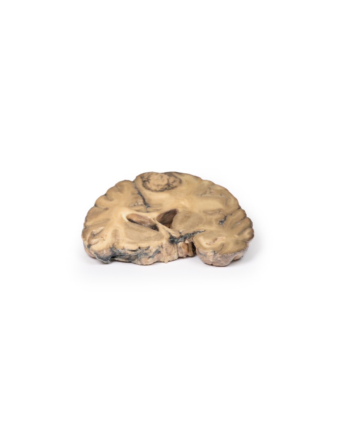 Questo campione di cervello viene tagliato sul piano coronale. Nel lobo frontale destro è evidente un tumore circoscritto, variegato, rosa-grigio. Il tumore coinvolge la sostanza grigia e bianca. La compressione del ventricolo laterale destro da parte della lesione è evidente con lo spostamento anche delle strutture della linea mediana.