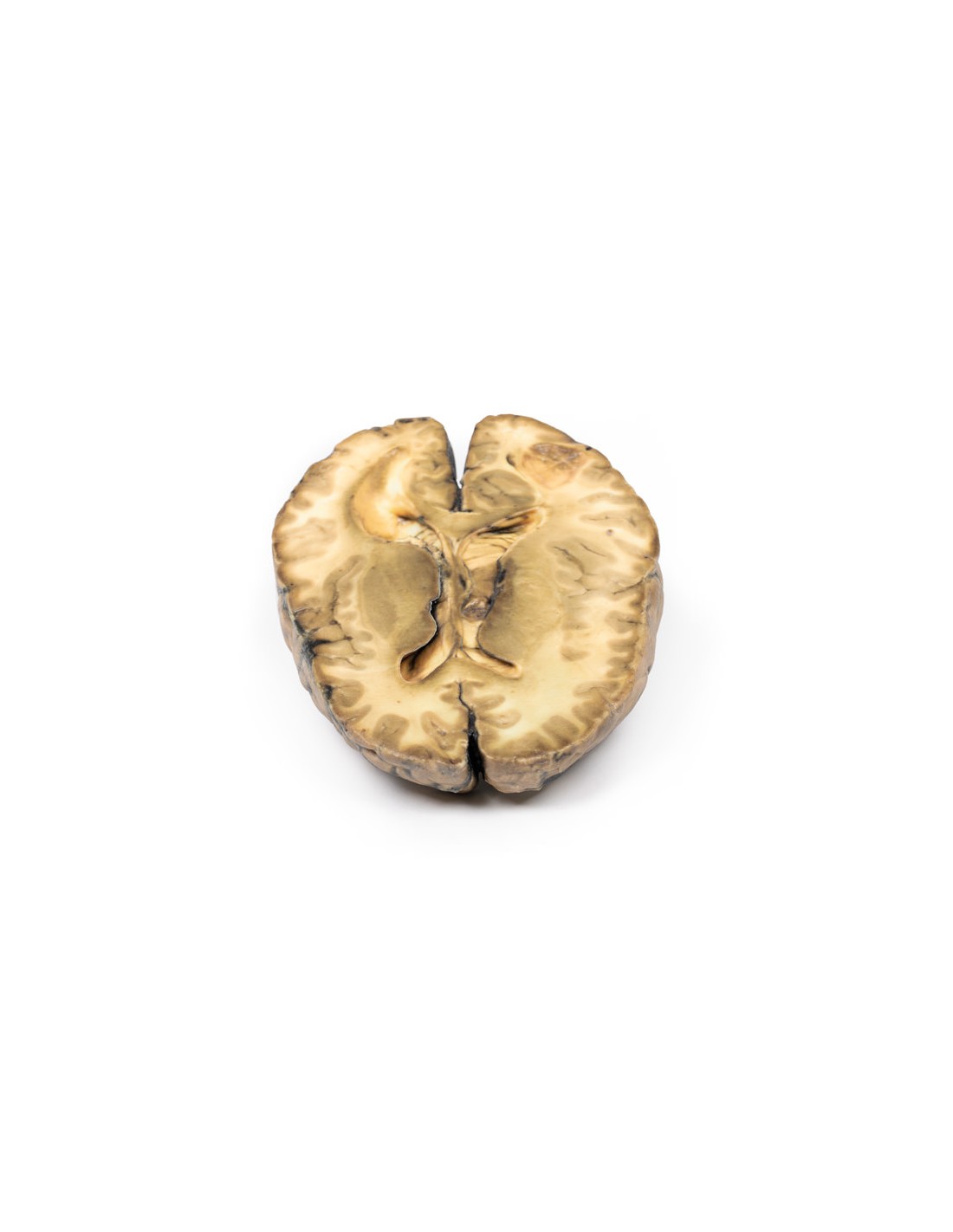 L'esemplare è il cervello affettato orizzontalmente. Nella proiezione superiore, l'emisfero destro è chiaramente ingrandito, in particolare nella regione parietale dove le circonvoluzioni sono allargate e sono evidenti 3 tumori cistici. Il più grande, 5 cm di diametro, si trova nella regione parietale destra. Un tumore più piccolo, 2 x 1,5 cm di diametro, si vede vicino al margine posteriore del tumore più grande. Un terzo, di 1,5 cm di diametro, è presente nella regione parietale sinistra. I tumori hanno coinvolto principalmente la sostanza bianca. La parete di ciascuna lesione è composta da tessuto grigiastro friabile e ispido. All'autopsia, si è verificata un'ulcerazione del tumore più grande nel ventricolo laterale destro (visto più chiaramente quando si esamina la superficie inferiore). È stata osservata anche un'ernia sottofalcina, così come lo spostamento dei gangli della base e della capsula interna. L'esame istologico ha rivelato carcinoma metastatico nelle aree vitali. Altre metastasi sono state trovate nel fegato e nelle ossa. L'istologia di una metastasi epatica era coerente con l'origine da un carcinoma mammario primario.