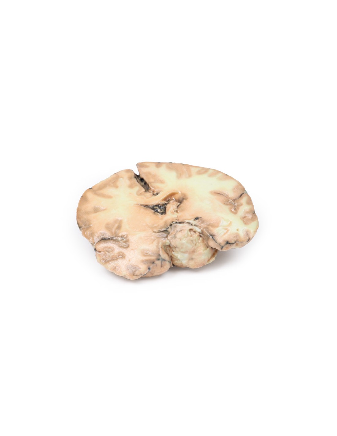 Le sezioni coronali del cervello post mortem mostrano un tumore necrotico ed emorragico di 4 cm. È evidente l'invasione del tumore dal lobo frontale inferiore nel ventricolo laterale. La diffusione meningea è evidente all'esame dell'aspetto posteriore del campione.