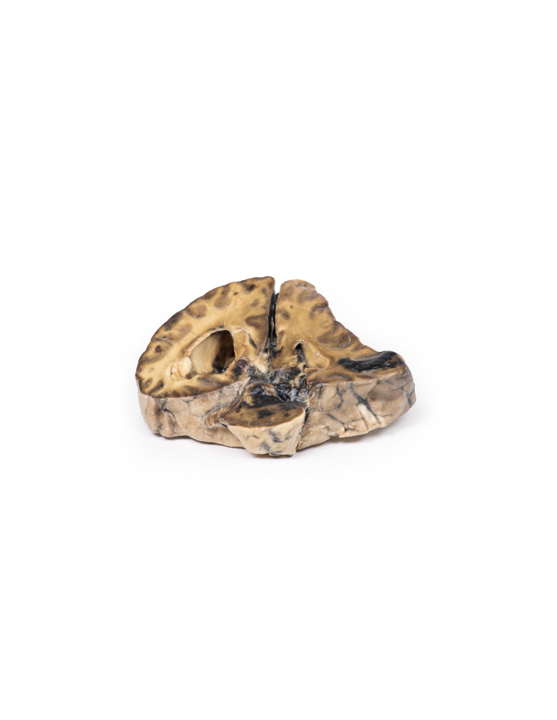 Il campione è una sezione coronale di un cervello. È evidente che il cervello è stato compresso lateralmente e verso il basso da una massa intracranica in espansione sul lato destro, probabilmente un meningioma. La massa originale non è presente. La faccia anteriore mostra uno spostamento delle strutture della linea mediana con ernia sottofalcina* del giro cingolato. La faccia posteriore (vedi foto) presenta emorragie di varia età all'interno del lobo temporale e del ponte, tipiche delle lesioni massicce sopratentoriali. C'è anche asimmetria ventricolare.