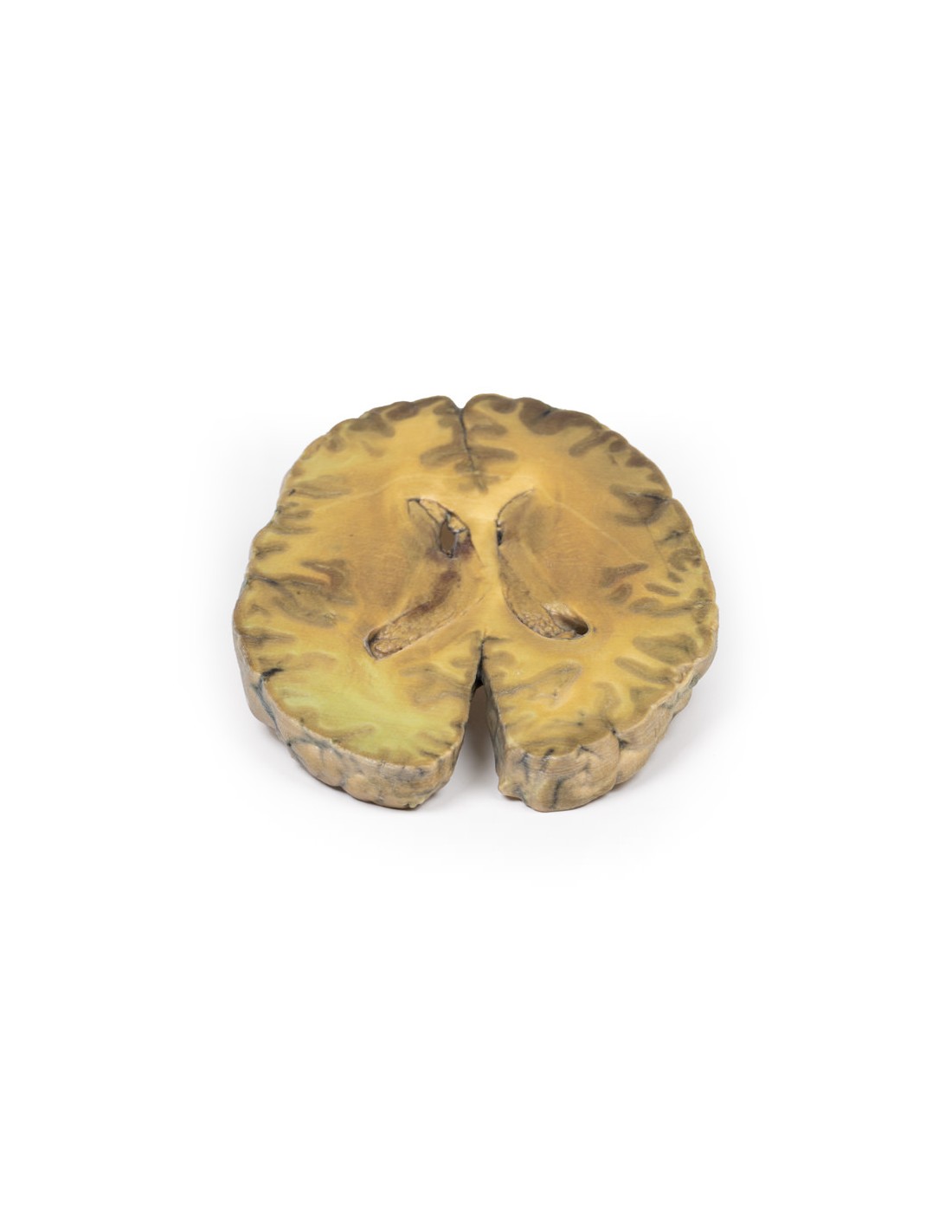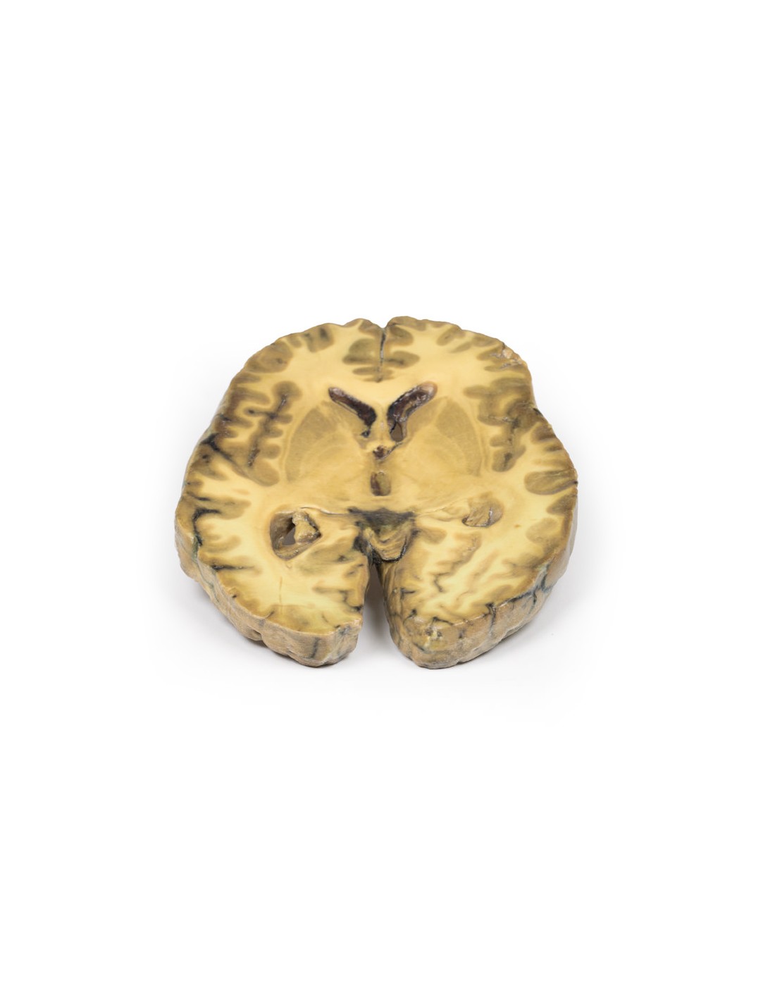 Questo esemplare è un esempio di ventricolite, con meningite pneumococcica e polmonite basale destra riscontrate anche all'autopsia. La fetta orizzontale attraverso entrambi gli emisferi cerebrali mostra entrambi i ventricoli laterali. I ventricoli mostrano un rivestimento ependimale ispessito e ruvido con accumulo di detriti cellulari attorno al plesso coroideo e anche nel corno anteriore. La superficie inferiore mostra cambiamenti simili e mostra anche la normale disposizione del nucleo caudato, del nucleo lentiforme e della capsula interna.