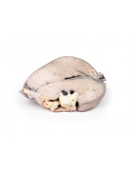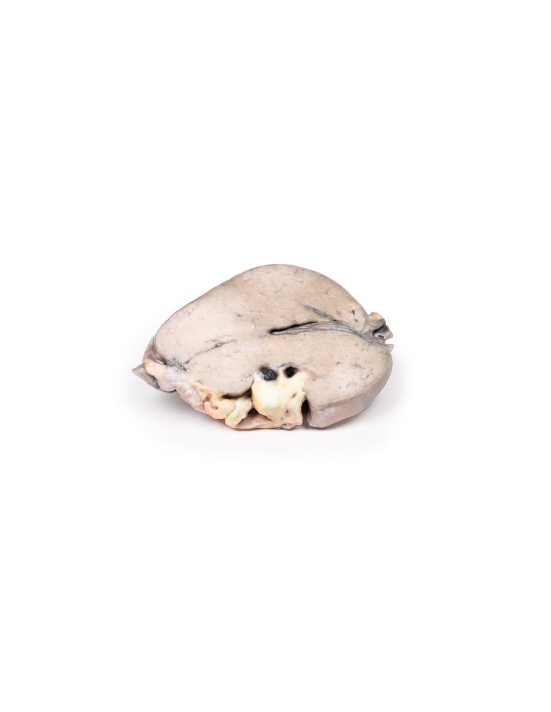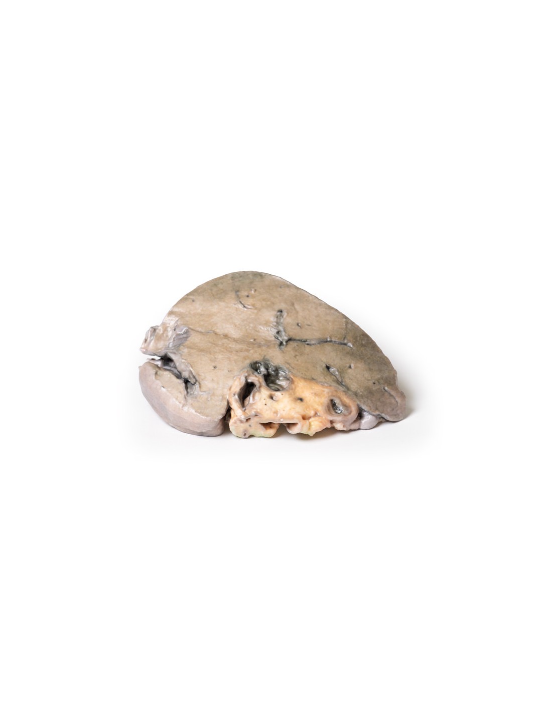 L'esemplare è una fetta di fegato montata per visualizzare la superficie del taglio. La capsula è leggermente ispessita e la sostanza epatica ha un aspetto finemente nodulare. I dotti biliari intraepatici sono dilatati. Quando si osserva la superficie posteriore o inferiore, si vede un tartaro pigmentato irregolare, di 10 mm di diametro, incastrato in un dotto epatico dilatato. Un altro calcolo più piccolo di 3 mm di diametro è stato rimosso. Questo campione rappresenta un esempio di cirrosi biliare secondaria dovuta a un'ostruzione del dotto di grandi dimensioni da calcoli epatici.