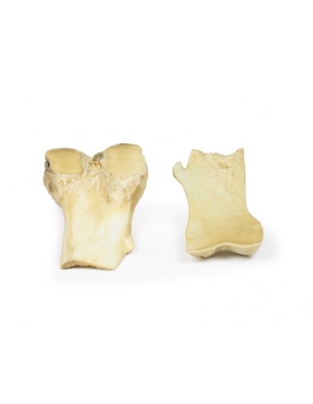 Il campione è l'estremità inferiore del femore destro del paziente, che è stato tagliato sul piano coronale e montato per visualizzare le superfici esterne. Una protuberanza ossea peduncolata lunga 2 cm sporge dall'aspetto mediale della diafisi femorale 7 cm sopra il condilo mediale. La proiezione è composta da osso normale con un sottile cappuccio di cartilagine ialina all'estremità. Questo è un esempio di osteocondroma.