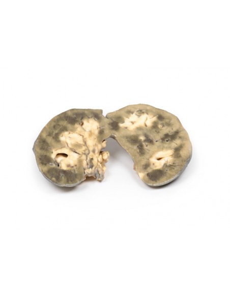 Il campione è un rene ingrossato. Il parenchima renale è stato quasi completamente sostituito da numerose cisti dilatate di dimensioni variabili, fino a 3 cm di diametro. Le cisti hanno pareti sottili e traslucide e alcune cisti contengono materiale di vari colori, che conferisce un aspetto "simile al marmo" alla superficie tagliata del rene. I colori variabili sono causati dalle secrezioni all'interno delle cisti, che possono essere mescolate con emorragie. La superficie esterna appare lobulata a causa di molteplici cisti sporgenti. L'eventuale parenchima renale residuo è gravemente atrofico causato dalla pressione delle numerose cisti. Questo è un esempio di malattia del rene policistico dell'adulto.