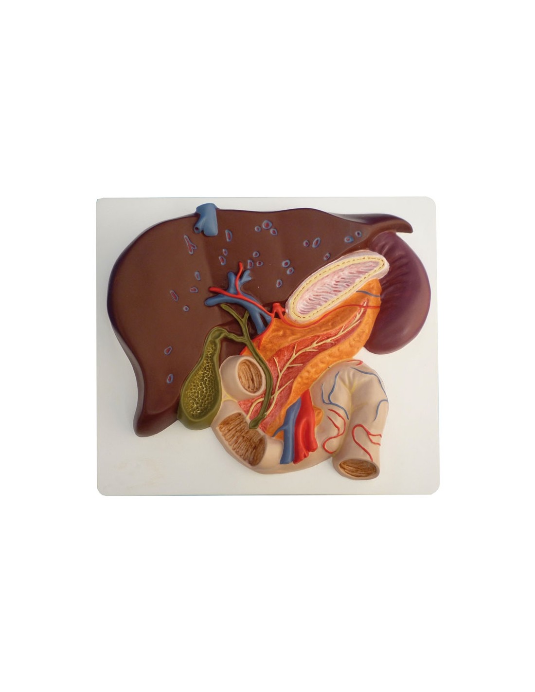 Questo modello a grandezza naturale mostra una sezione del fegato con cistifellea, pancreas e duodeno; include i dotti epatici e pancreatici.