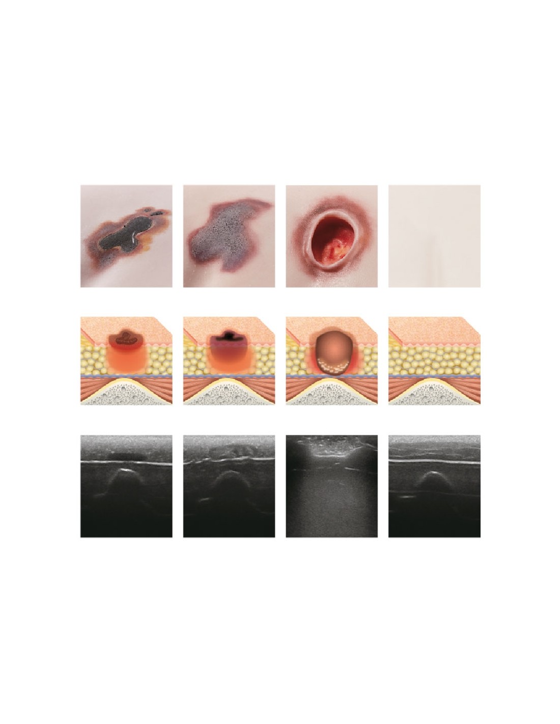 L'osservazione di caratteristiche come la perdita della fascia superficiale, aree localizzate di scarsa luminosità e la posizione e la profondità di reperti anormali rende possibile confermare una lieve piaga da letto di categoria / stadio da I a II.