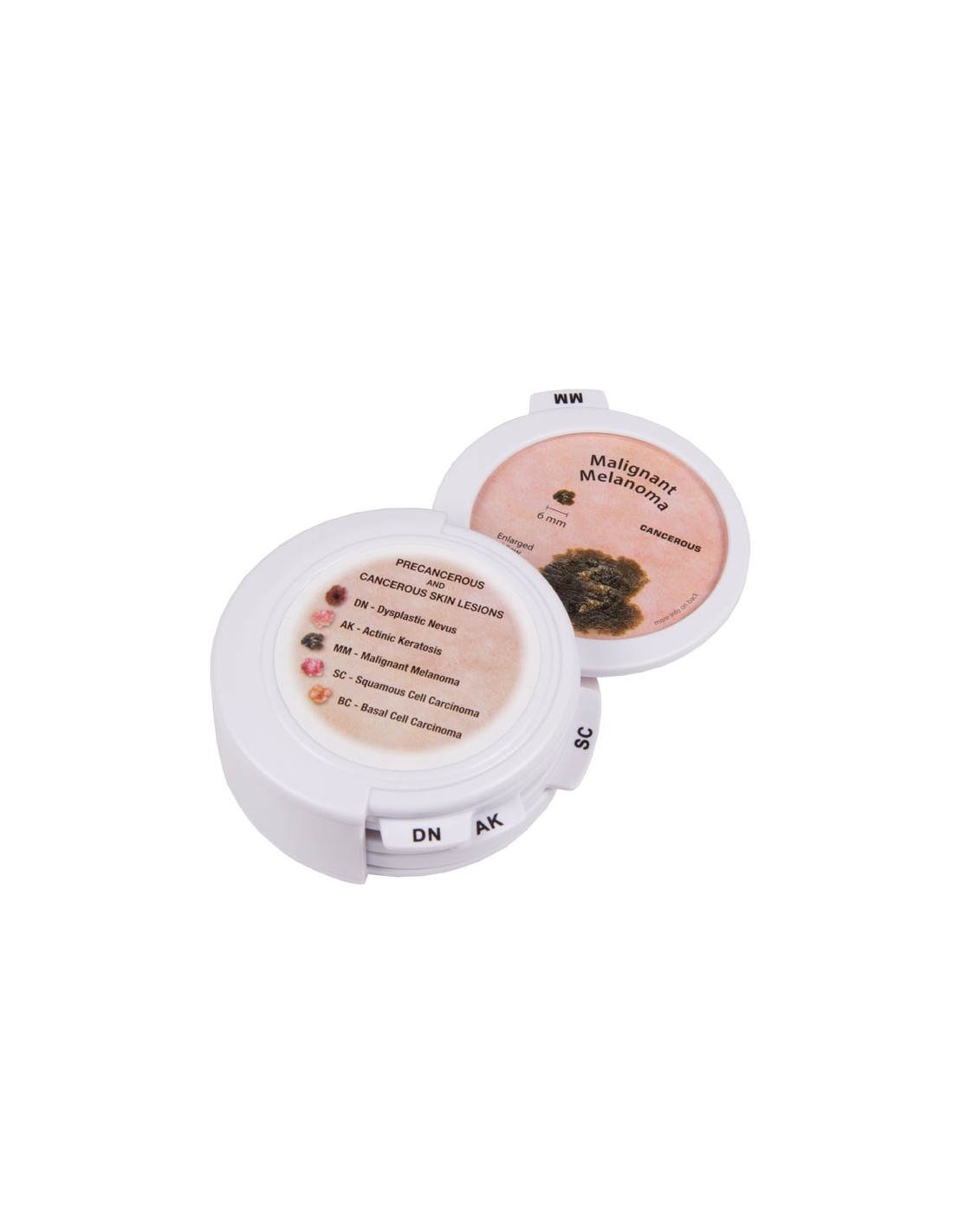 Questo modello presenta viste a grandezza naturale e ingrandite di nevo displastico, cheratosi attinica, melanoma maligno, carcinoma a cellule squamose e lesioni cutanee da carcinoma basocellulare.