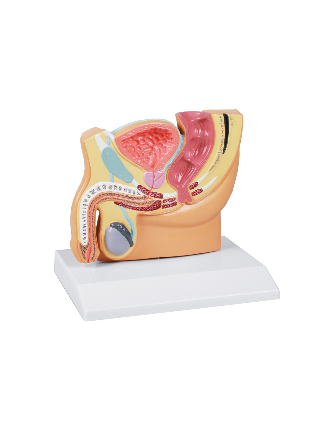 Il modello mostra gli organi genitali maschili, la vescica con ureteri, la prostata e l'ano.