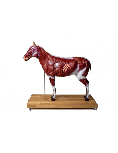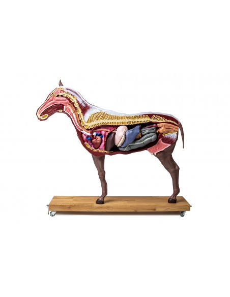 Un modello di cavallo (giumenta), 1/3 a grandezza naturale. Destinato a scopi didattici, per alunni e studenti. Il modello è installato su base con ruote ed è divisibile in due parti lungo il piano sagittale.